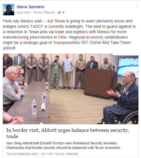 In border visit, Abbott urges balance between security, trade https://t.co/Gnhxjo3wtc via @TexasTribune— Dr.Steven D.Sanders (@DocEngineering) February 2, 2017